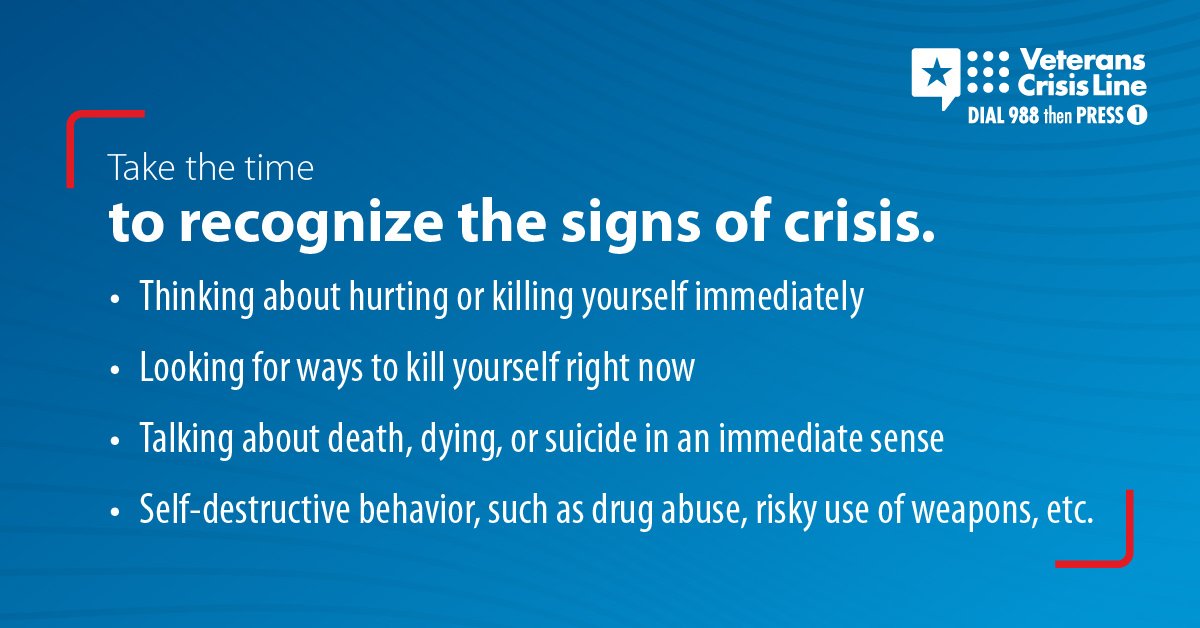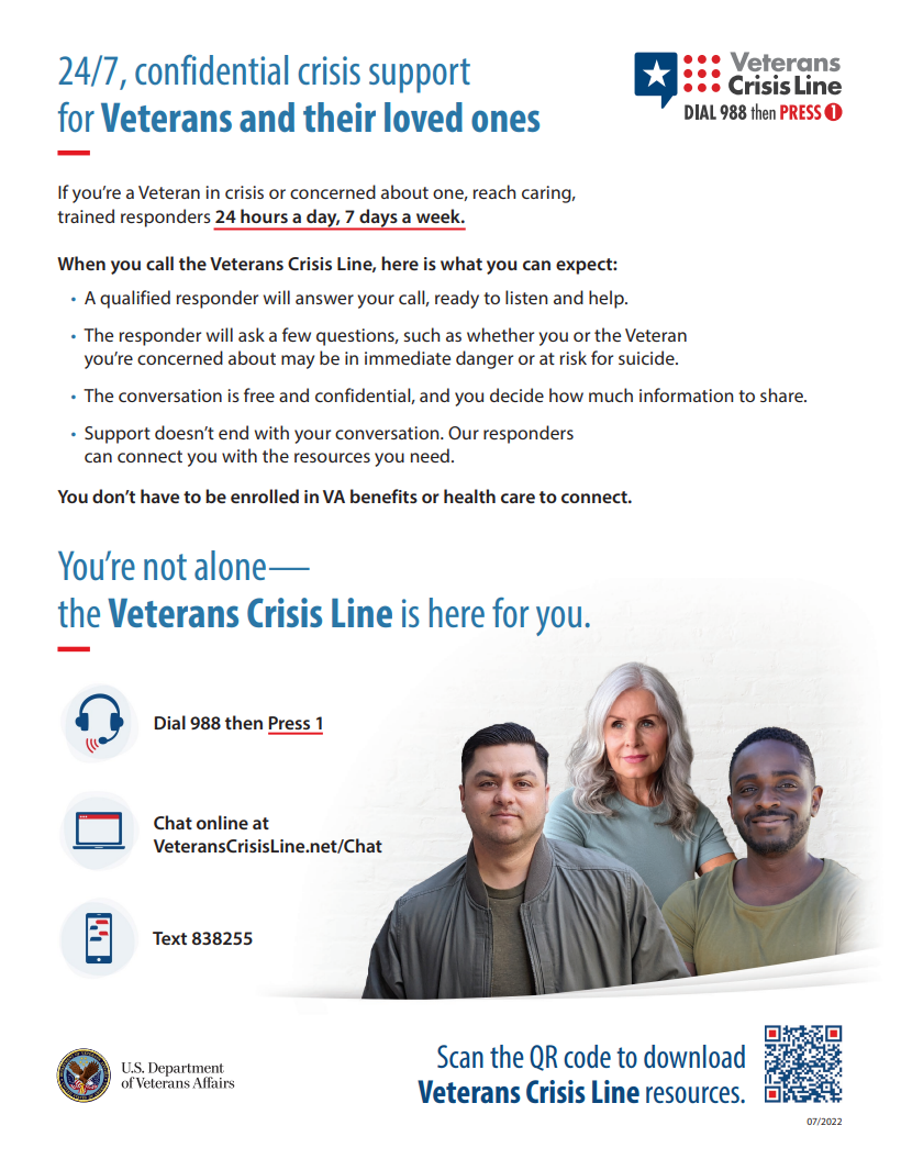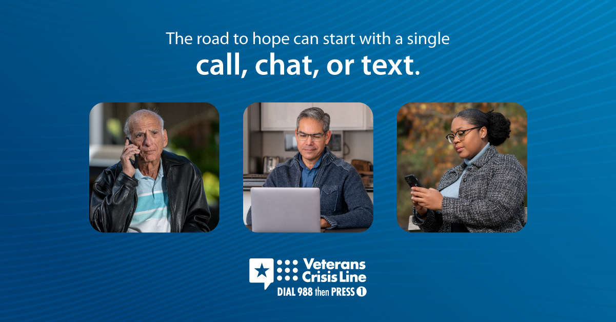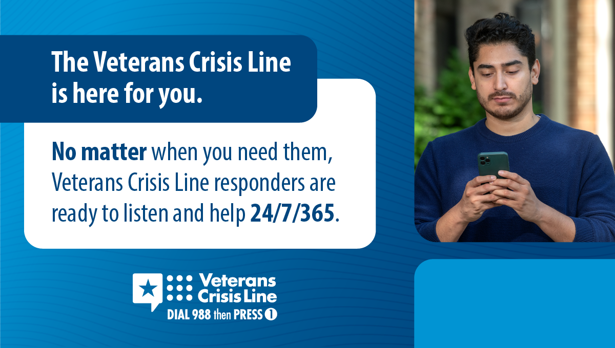 The Veterans Crisis Line offers support 24/7. If you’re a Veteran in crisis or worried about a Veteran, call, chat, or text now.